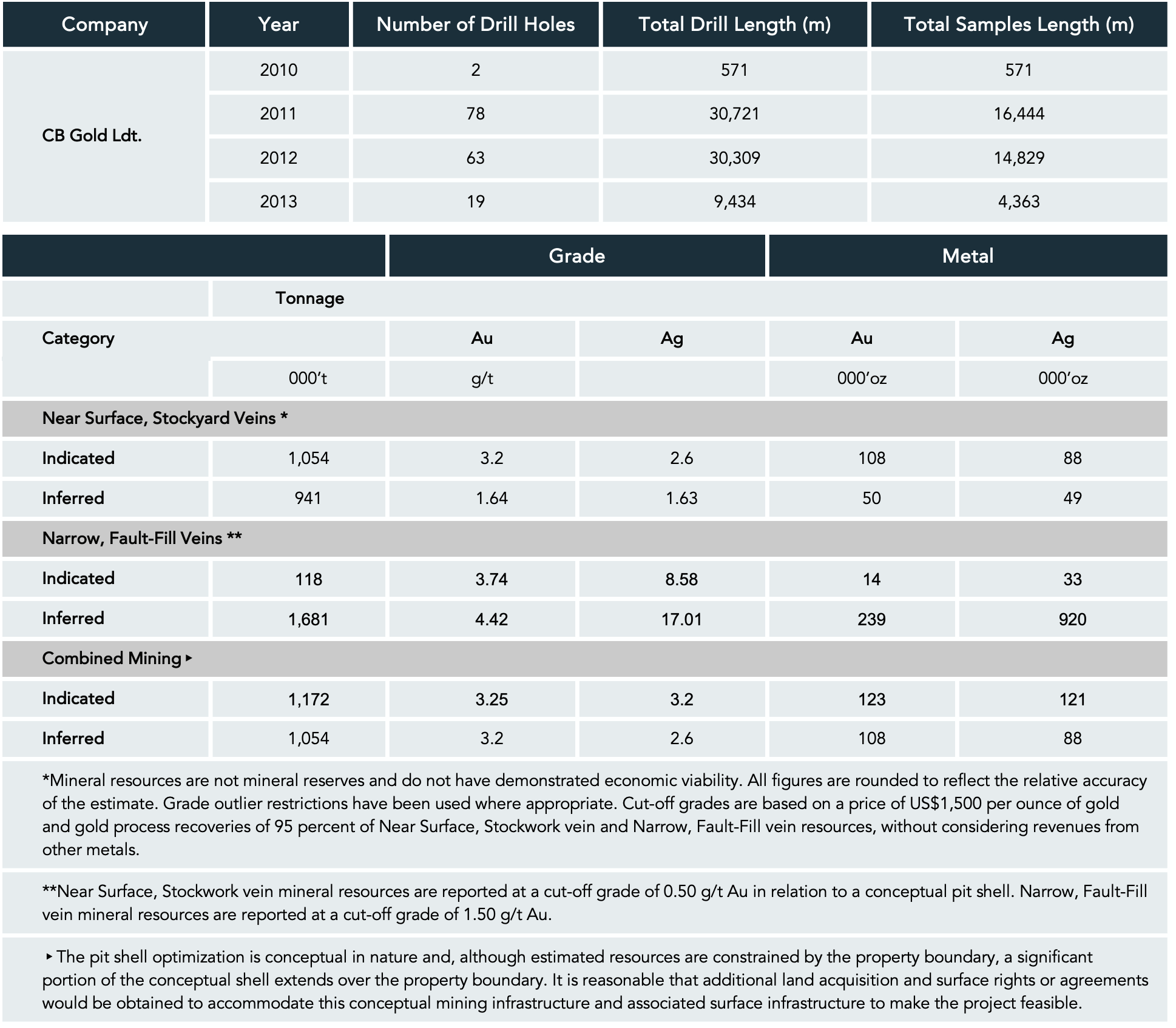 From November 2010 to November 2013, CB Gold completed a total of 162 diamond drill holes, totaling 71,035 m on the Veta Gold Project. Due to the high-relief of the project area, and to increased delineation efficiency, multiple drill holes were completed from individual drill platforms, as summarized in the table to the left.