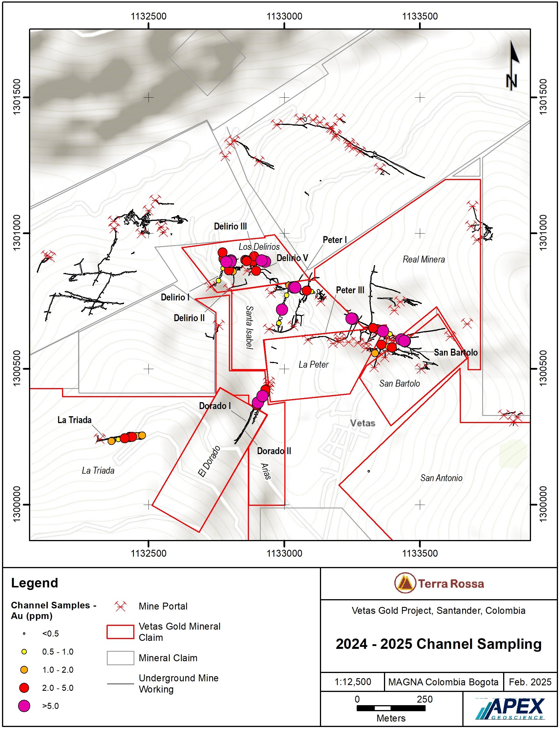 • Work at the Vetas Gold Project, a subsidiary of Terra Rossa, executed an initial sampling program in its mining tenures near the town of Vetas, Santander, focused on La Triada mine workings in 2023, and between December 2024 and February 2025, a more extensive sampling program, within underground artisanal mine labors developed by informal artisanal mine workers.
