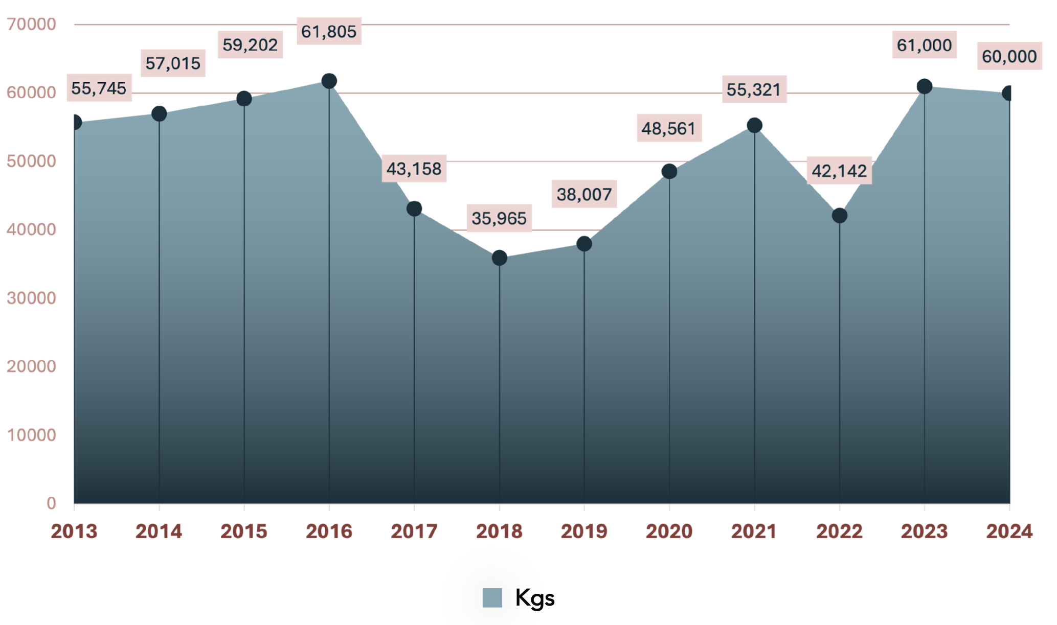 The data reached an all-time high of 66,178.000 kg in 2012 and a record low of 15,482.000 kg in 2007.